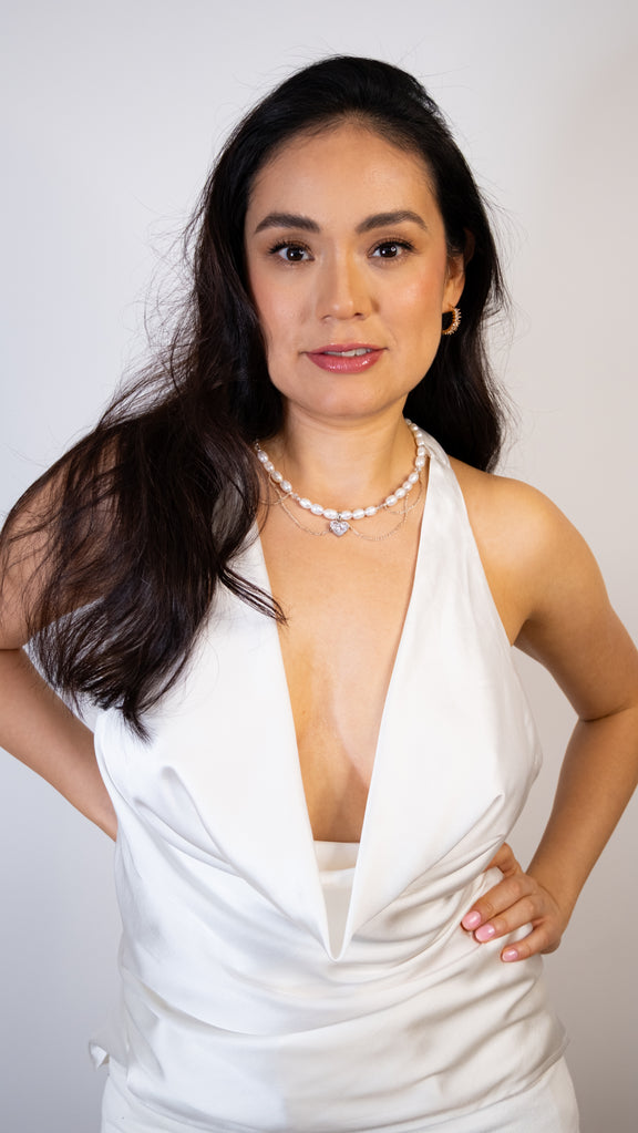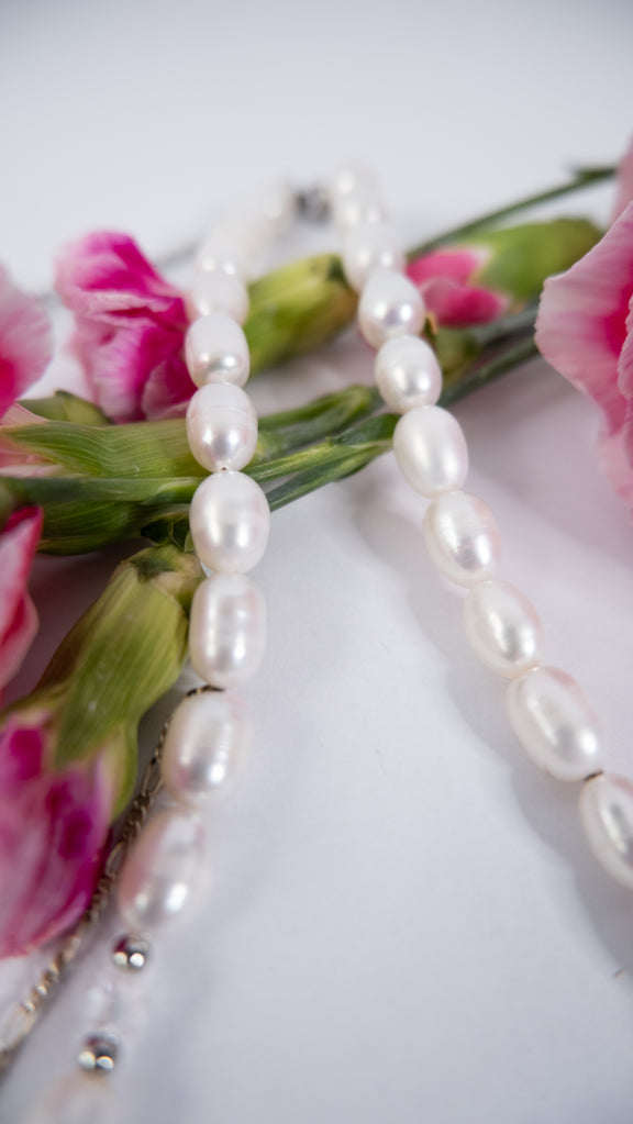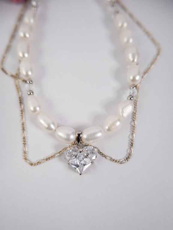 Collar de perla natural de arroz con dije de zirconia y cristal austriaco con cadenas de plata 925.